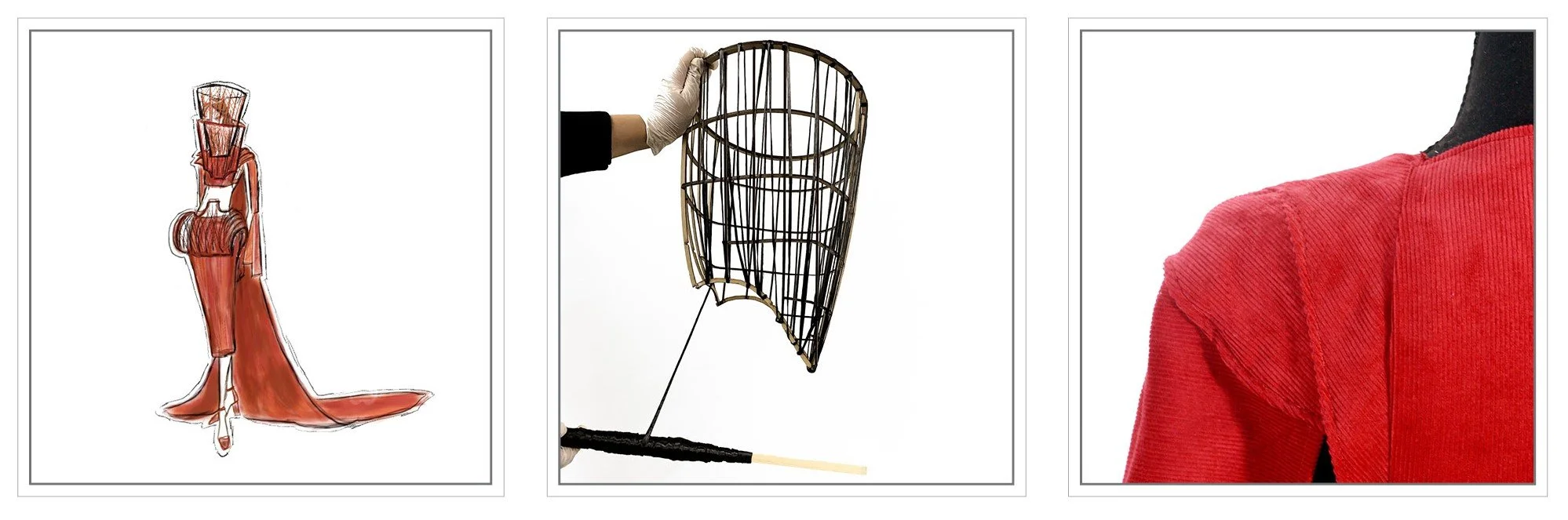Designing through the medium of garment construction alleviates architecture from typical constraints, and this two-part project makes realizations of new discoveries and repositions them within the framework of architecture. This garment observes the human figure as the initial blueprint and begins to reshape parts of the whole through elongation. Focus areas include the hips, neck, and arms. To further enhance this effect, each garment contains tapered extensions that reduce the blunt edge and woven frames serve as a method of blurring the boundary between human profile and extension. Drawing from the traditional garment boning technique of sewing plastic into fabric, this design contains multiple frames of MDF fabricated to withstand the tension created by woven carbon fiber threads, Bold color is explored as a blocking technique for highlighting the separation between human figure and intervention, drawing attention to the elongation of areas not dictated by fabric.